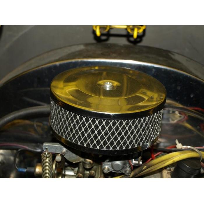 Dieser verchromte Luftfilter passt direkt auf den serienmäßigen Vergaser und wird mit einer mitgelieferten Schlauchschelle festgeklemmt.